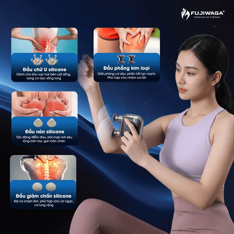 - Đầu phẳng kim loại: Giải phóng cơ sâu với lực phản hồi mạnh, phù hợp cho nhóm cơ lớn như đùi, bắp chân, lưng.